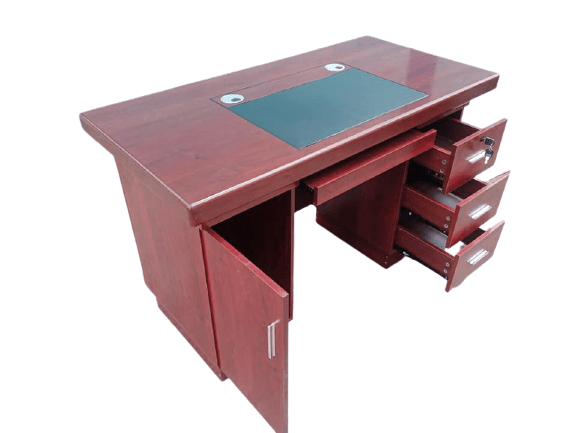 1.2 meters executive imported desk if a quality office fitment made of pure MDF. It consists of 3 lockable drawers on one side (right side) and one lockable door on the other side (left side). It also consists of a mounted black writing pad (for easier writing ) and two wire managers for essential wire arrangement of various electronics used to effect your day to day tasks.