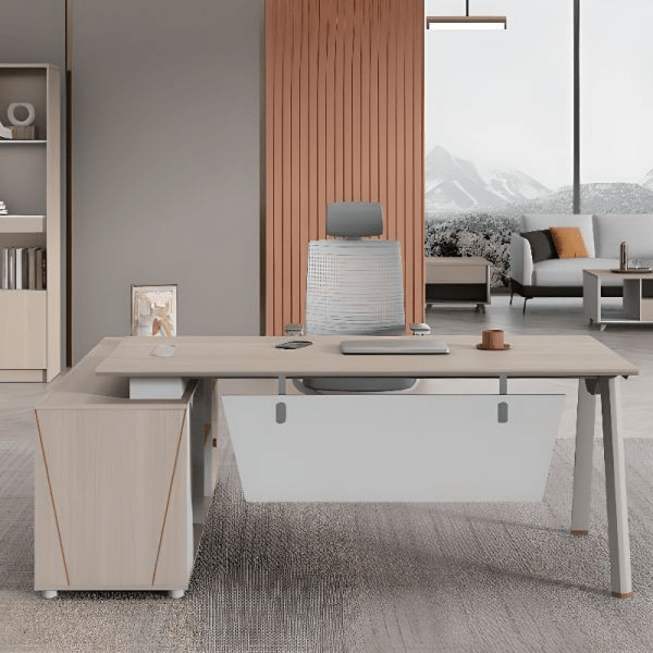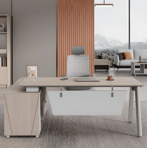 The L-shaped desk offers ample legroom and ergonomic positioning for comfortable seating. Its corner design maximizes space in smaller offices while providing a versatile workspace for various tasks. Additionally, the desk can be paired with office chairs, storage cabinets, or pedestals for enhanced functionality.