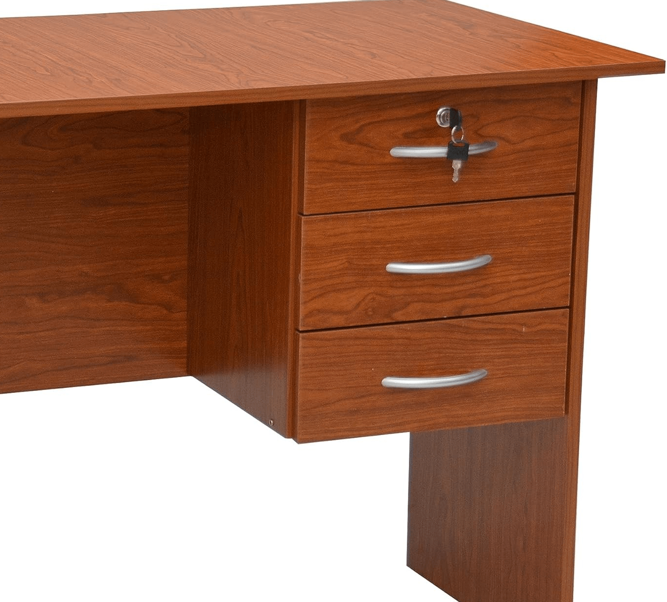 The built-in three-drawer pedestal on one side of the desk allows for practical organization of supplies and files. One top drawer is perfect for stationery and smaller items, while the two larger drawers accommodate folders, books, or personal items. As a result, your workspace remains clutter-free and professional.
