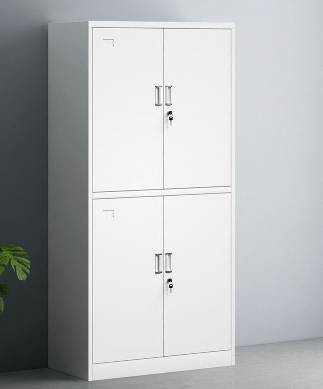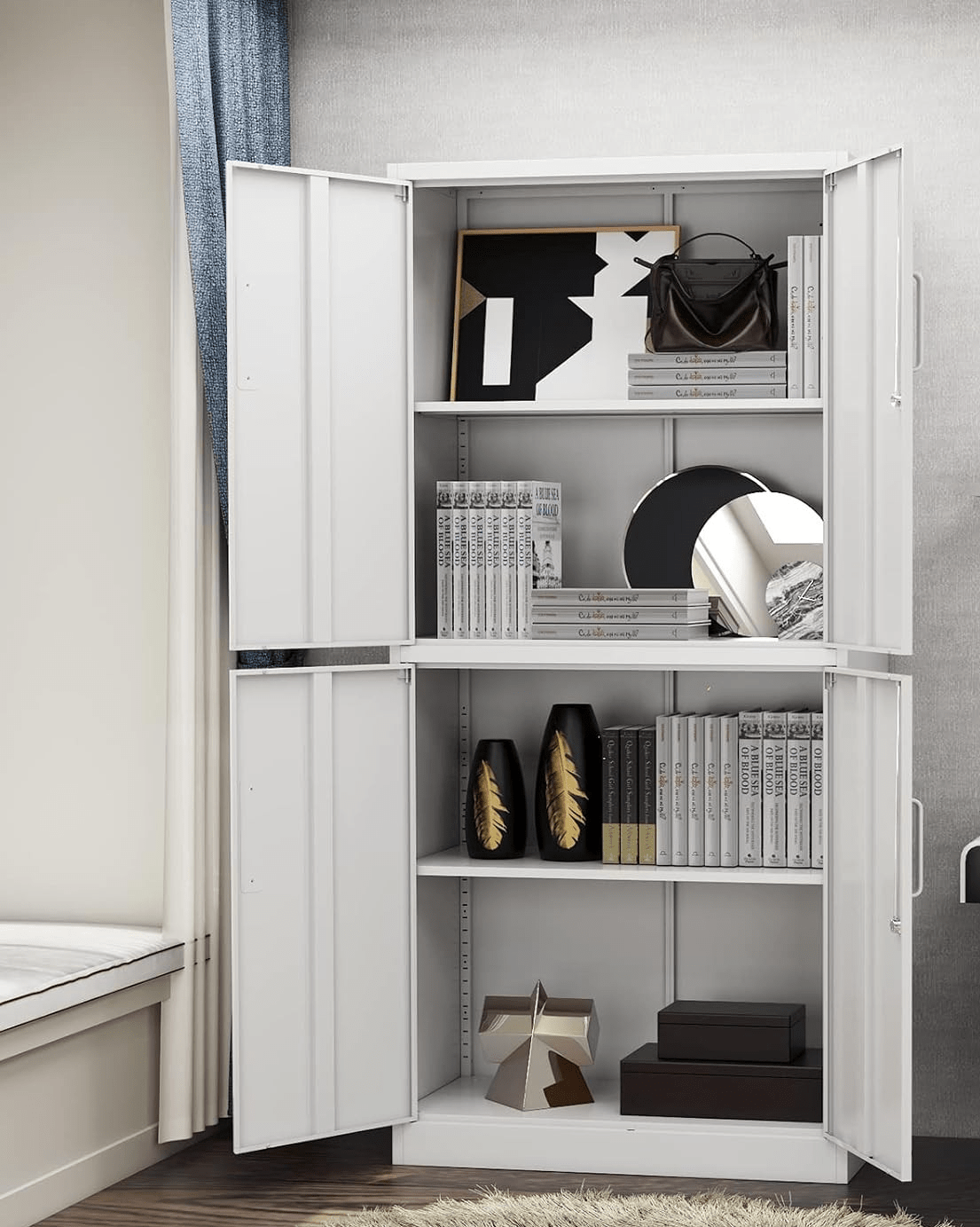 With a compact footprint, the 4-Door Storage Cabinet fits easily in tight office spaces or corners. Its modern design and neutral colors blend well with various office decors, enhancing the overall workspace aesthetics.
