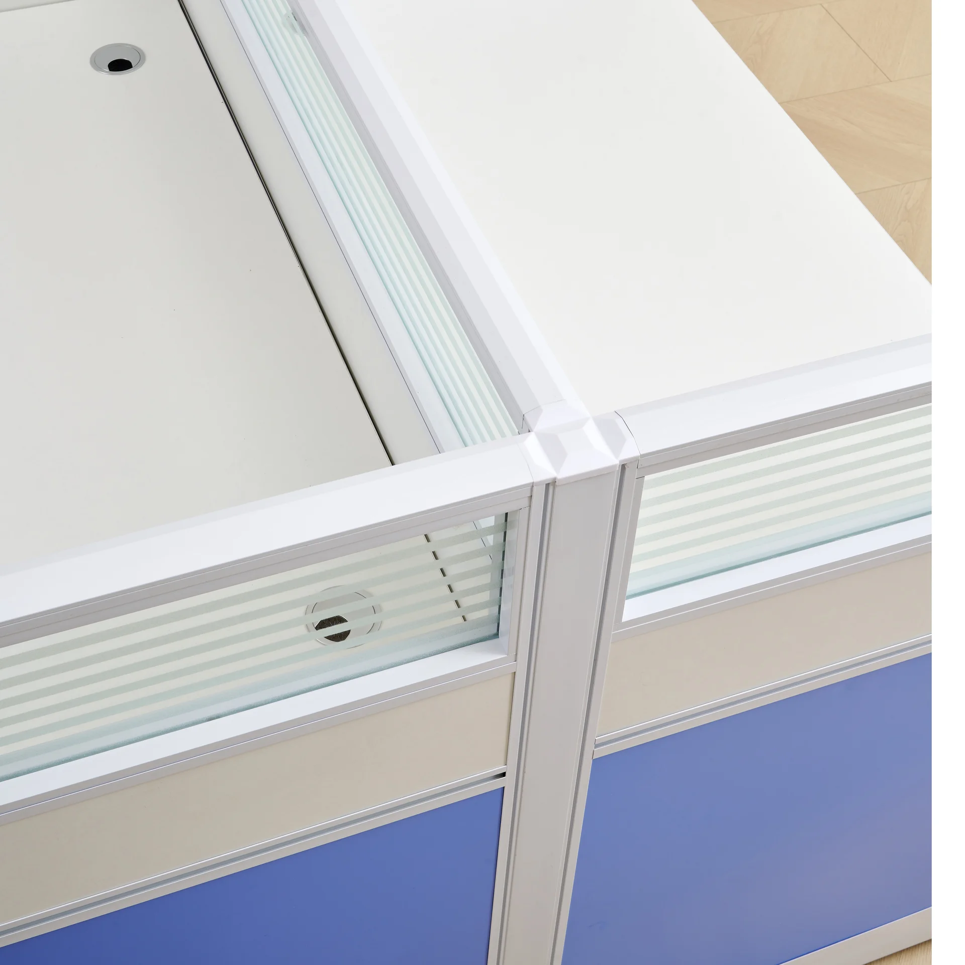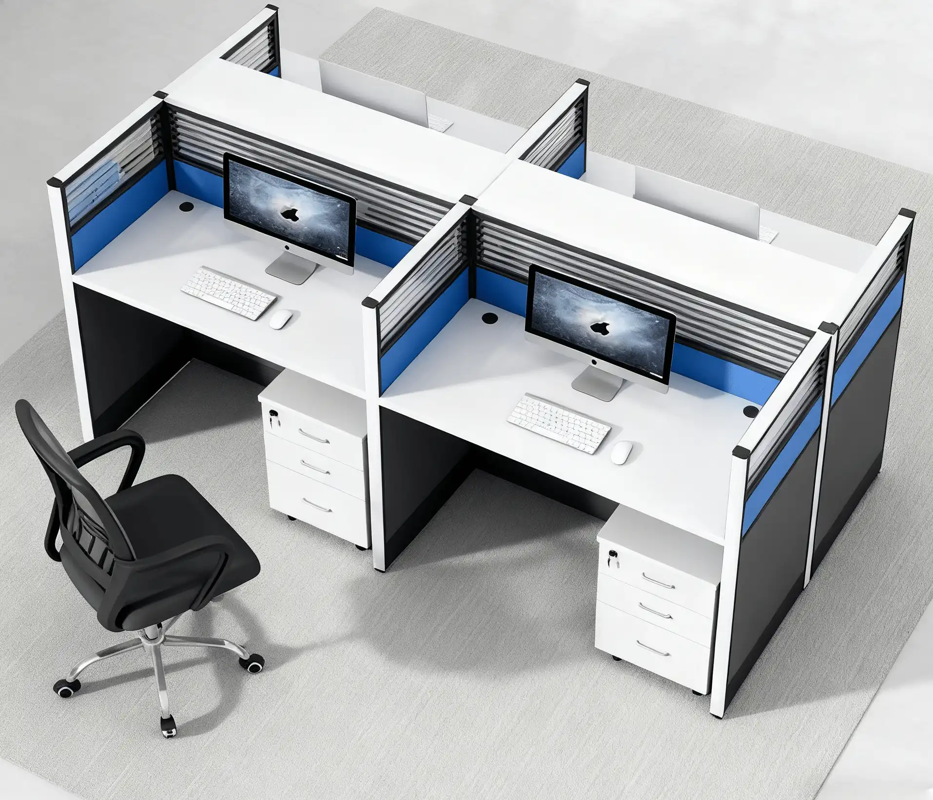 In addition to efficient space utilization, the 4-way workstation prioritizes ergonomic design to support employee health and comfort. Each workstation includes ample legroom, proper desk height, and designated areas for office chairs, helping users maintain correct posture throughout the day. Furthermore, integrated cable management systems ensure that wires and cords are neatly organized, reducing clutter and minimizing distractions. By combining ergonomic principles with practical design, this workstation helps reduce fatigue, increase focus, and improve overall productivity.