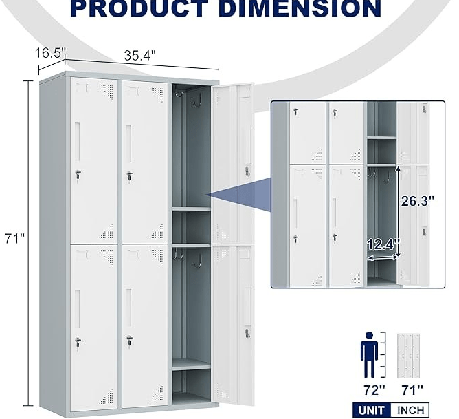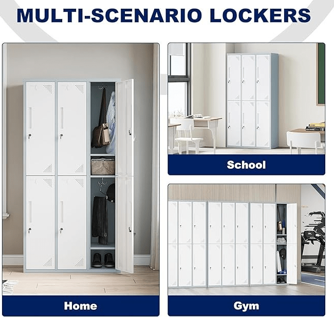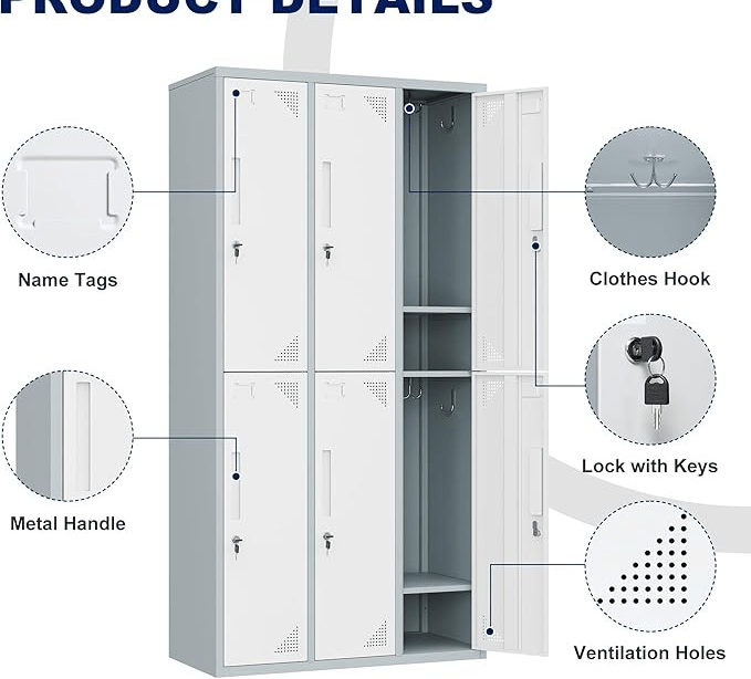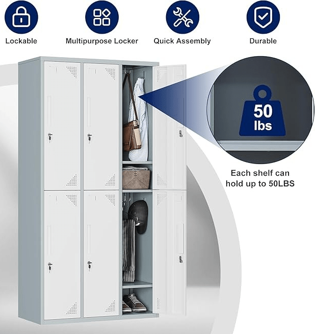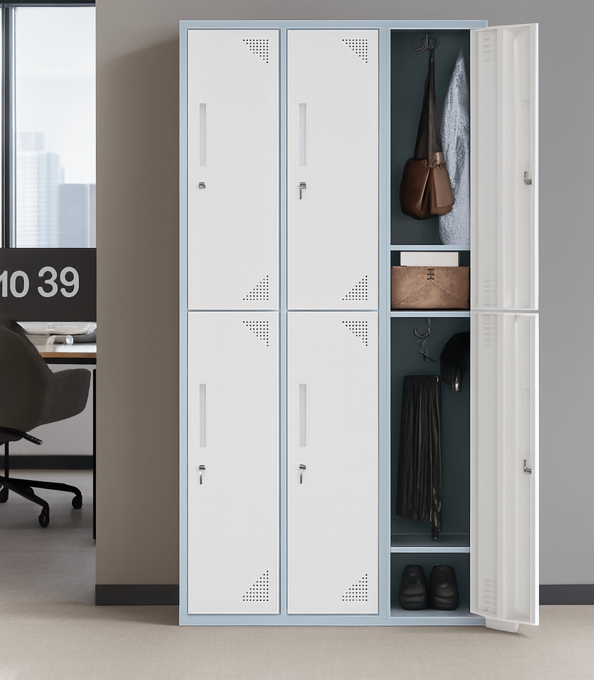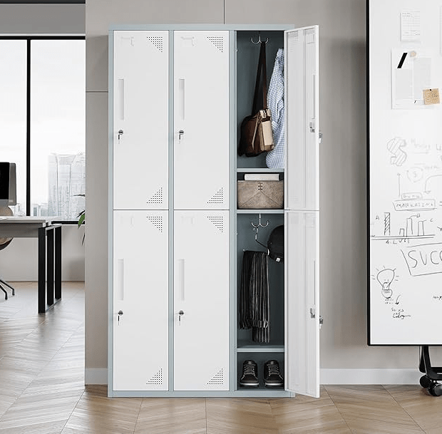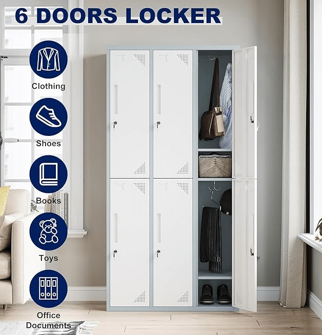 The 6-Door Storage Office Cabinet features individually sectioned compartments that allow for efficient categorization of files, personal belongings, and office materials. Each door opens to a separate space, providing privacy and reducing clutter in the workplace. Additionally, adjustable shelves inside the compartments offer flexibility to store different items securely. As a result, it supports a tidy, organized environment that improves workflow and productivity while maintaining a professional appearance.