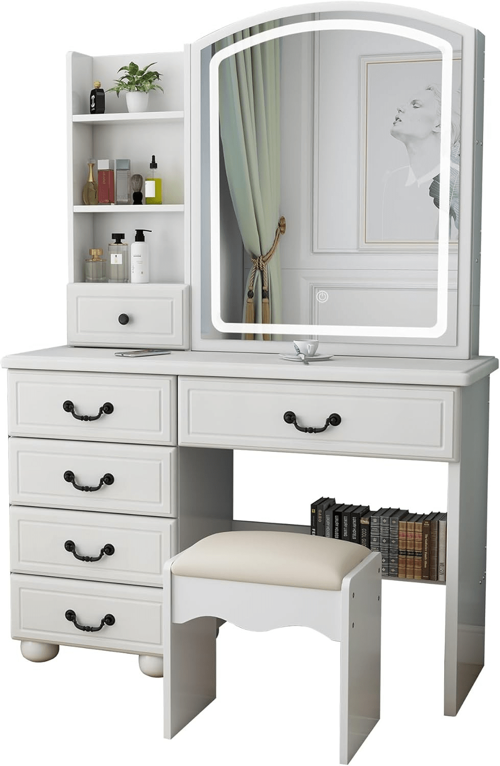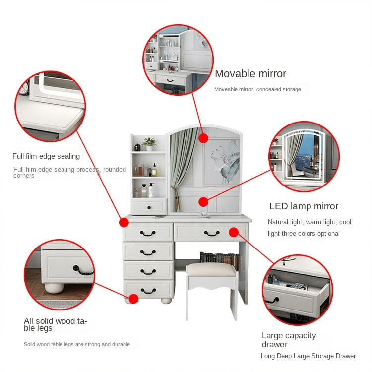 The dresser desk features multiple drawers and compartments, offering generous storage for cosmetics, accessories, and personal items. Its well-planned layout helps you keep everything organized and easily accessible, reducing clutter and saving time. The integrated mirror adds convenience, allowing you to style your hair, apply makeup, or prepare for the day without needing additional furniture. With a design that combines practicality and elegance, this dresser desk transforms your routine into a more efficient and stylish experience.