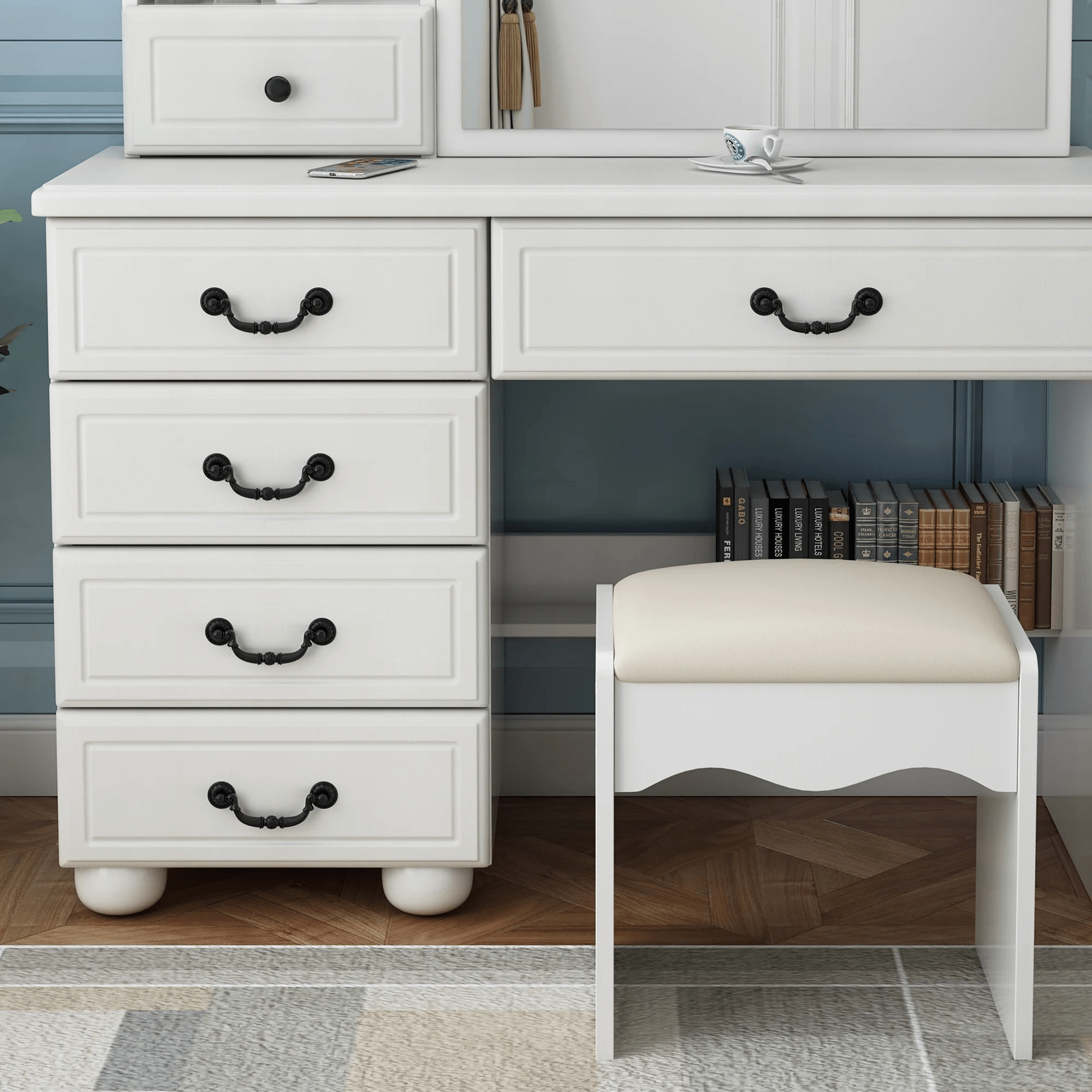 Beyond functionality, this dresser desk adds a touch of sophistication to any room. The integrated mirror and stylish design enhance your bedroom décor, while the compact yet spacious layout fits perfectly into small or medium-sized spaces. Whether used for daily routines or as an accent furniture piece, it provides both practical storage solutions and visual appeal.