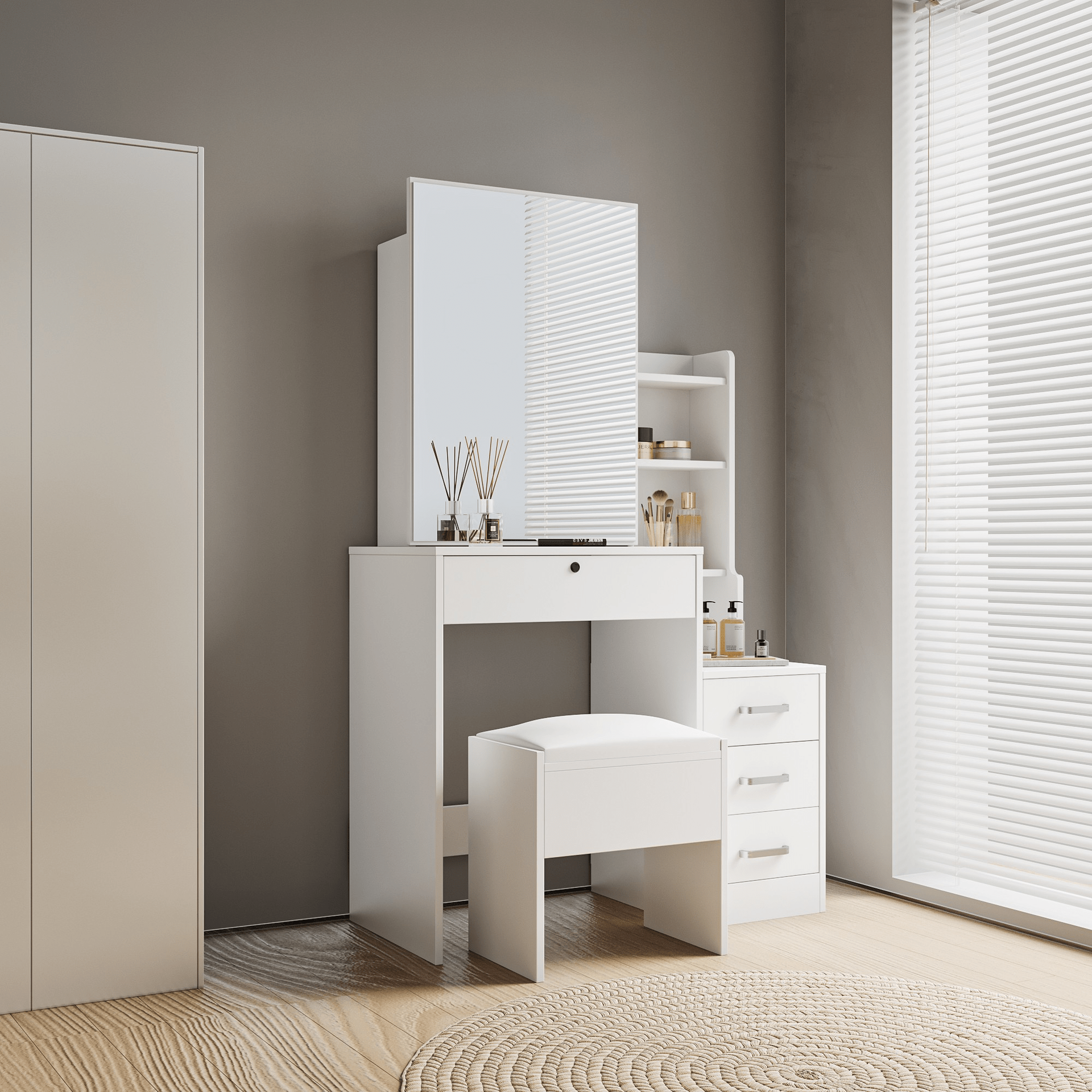 In addition, this dressing table set features ample storage options. Drawers and compartments allow you to organize cosmetics, jewelry, skincare products, and accessories neatly. As a result, your space remains clutter-free and well-arranged. The mirror is positioned at an ideal height, helping you maintain good posture while getting ready, which adds to daily comfort.