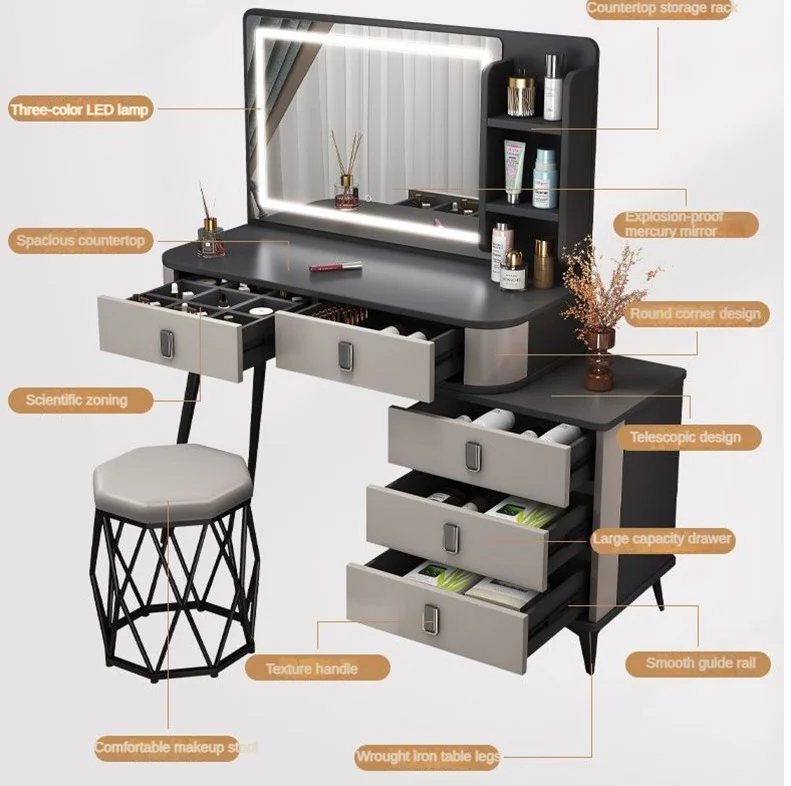 One of the key features of this modern dressing table is its built-in LED lights. Strategically positioned around the mirror, these lights provide bright, even illumination that mimics natural daylight.