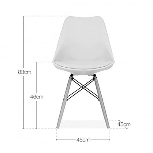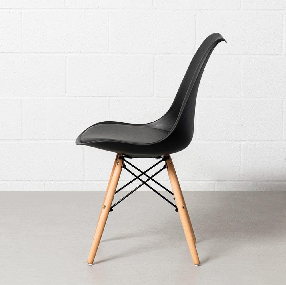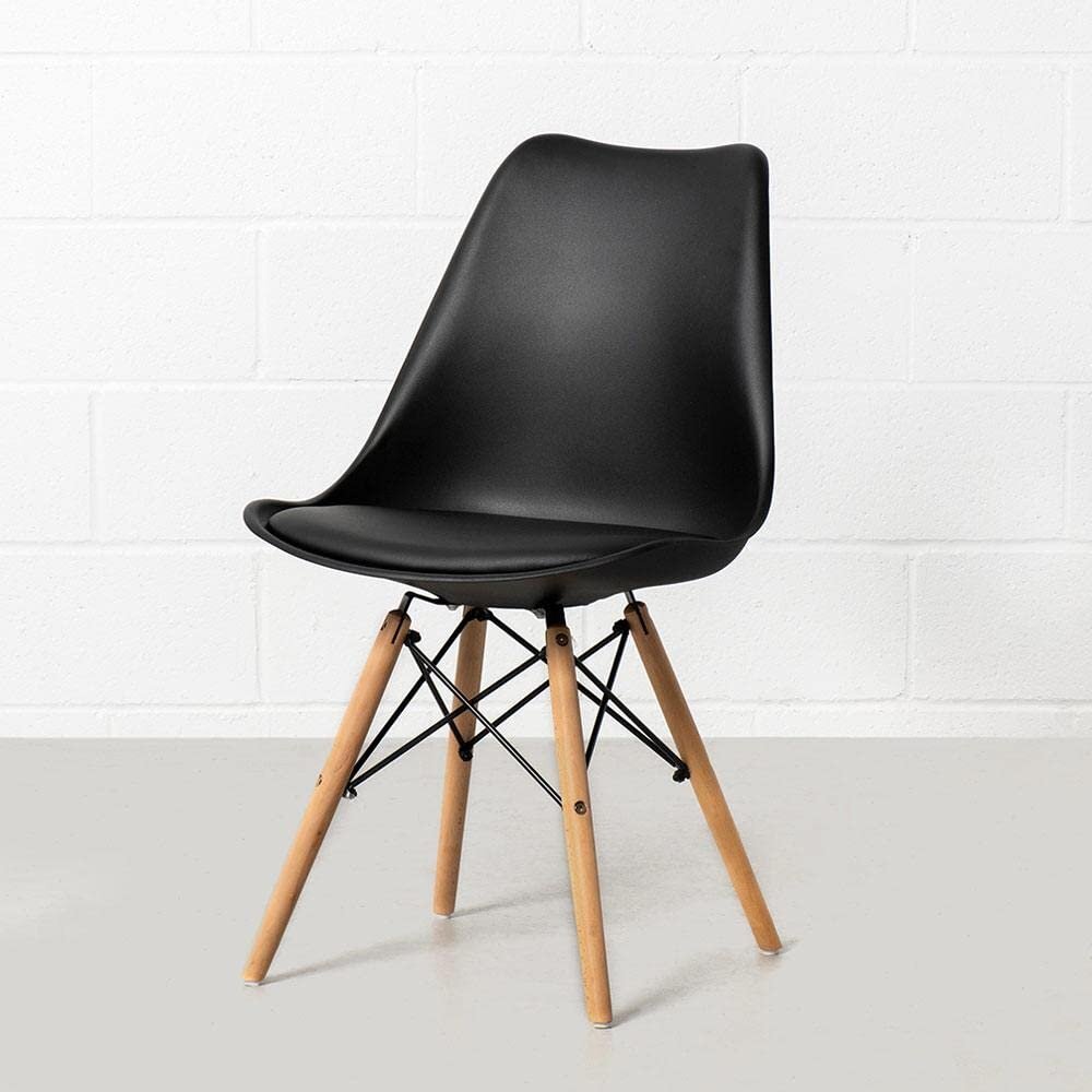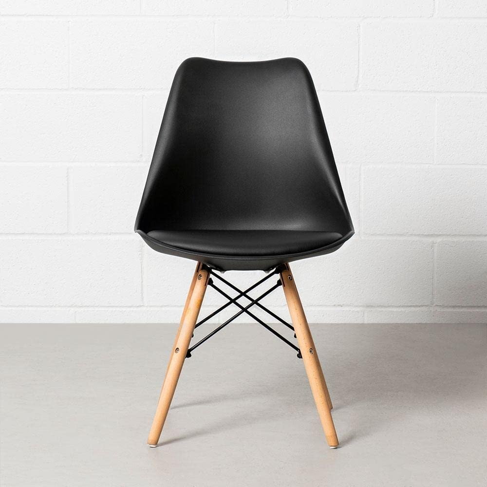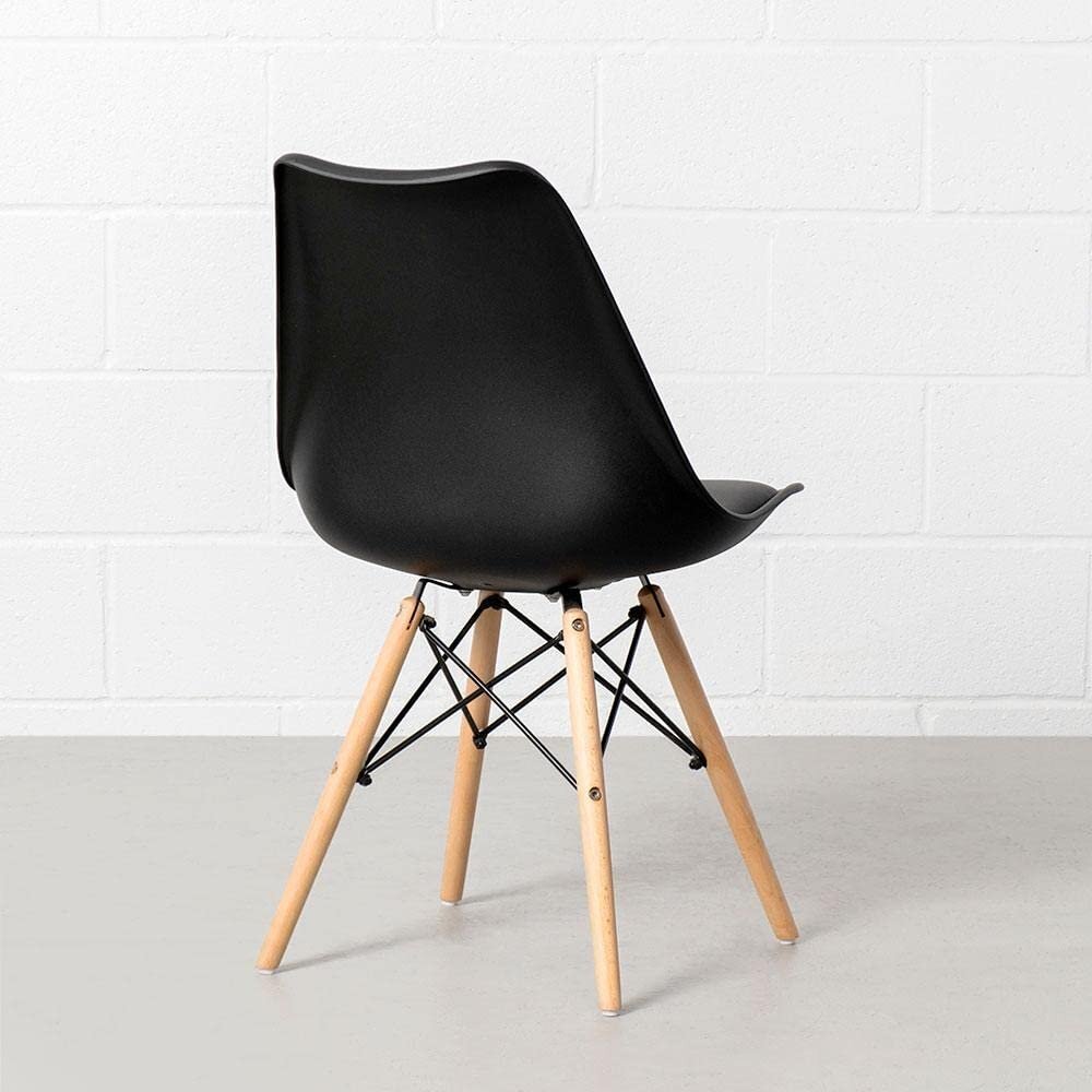 - Materials: Molded plastic shell, high-density foam padding, wooden legs, metal Eiffel-style frame