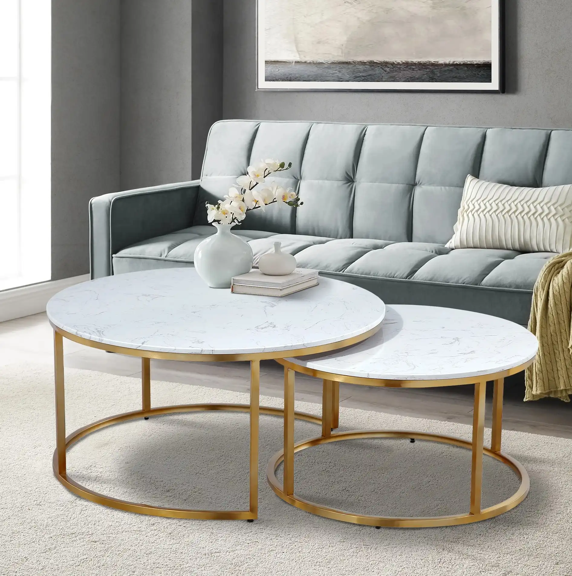 One of the standout features of this pair marble coffee table set is its elegant marble tabletop. The smooth, polished surface not only enhances visual appeal but also provides a durable and easy-to-clean finish. The natural marble patterns add uniqueness to each table, ensuring that no two pieces look exactly the same.