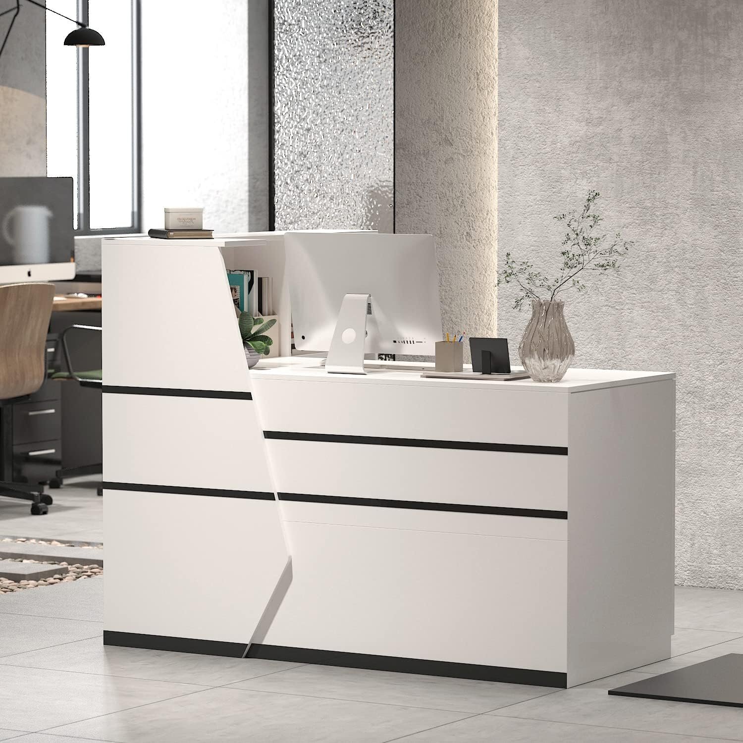 Assembly: The reception desk requires assembly and comes with detailed instructions and all necessary hardware. Assembly is straightforward, typically taking 45-60 minutes to complete.