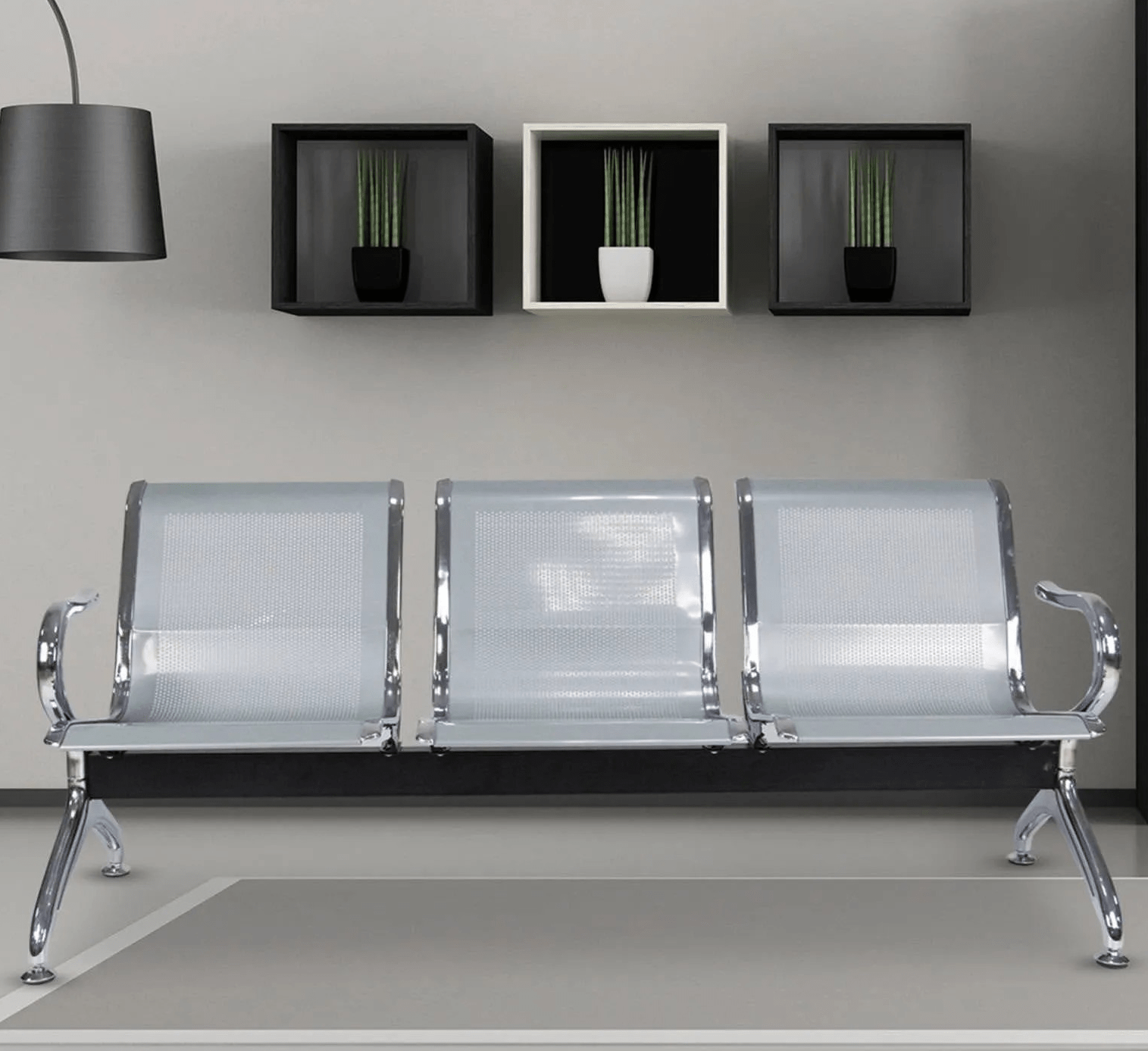 waiting room bench, 3-seat bench, linked seating, durable office bench, reception seating, metal frame bench, compact waiting bench.